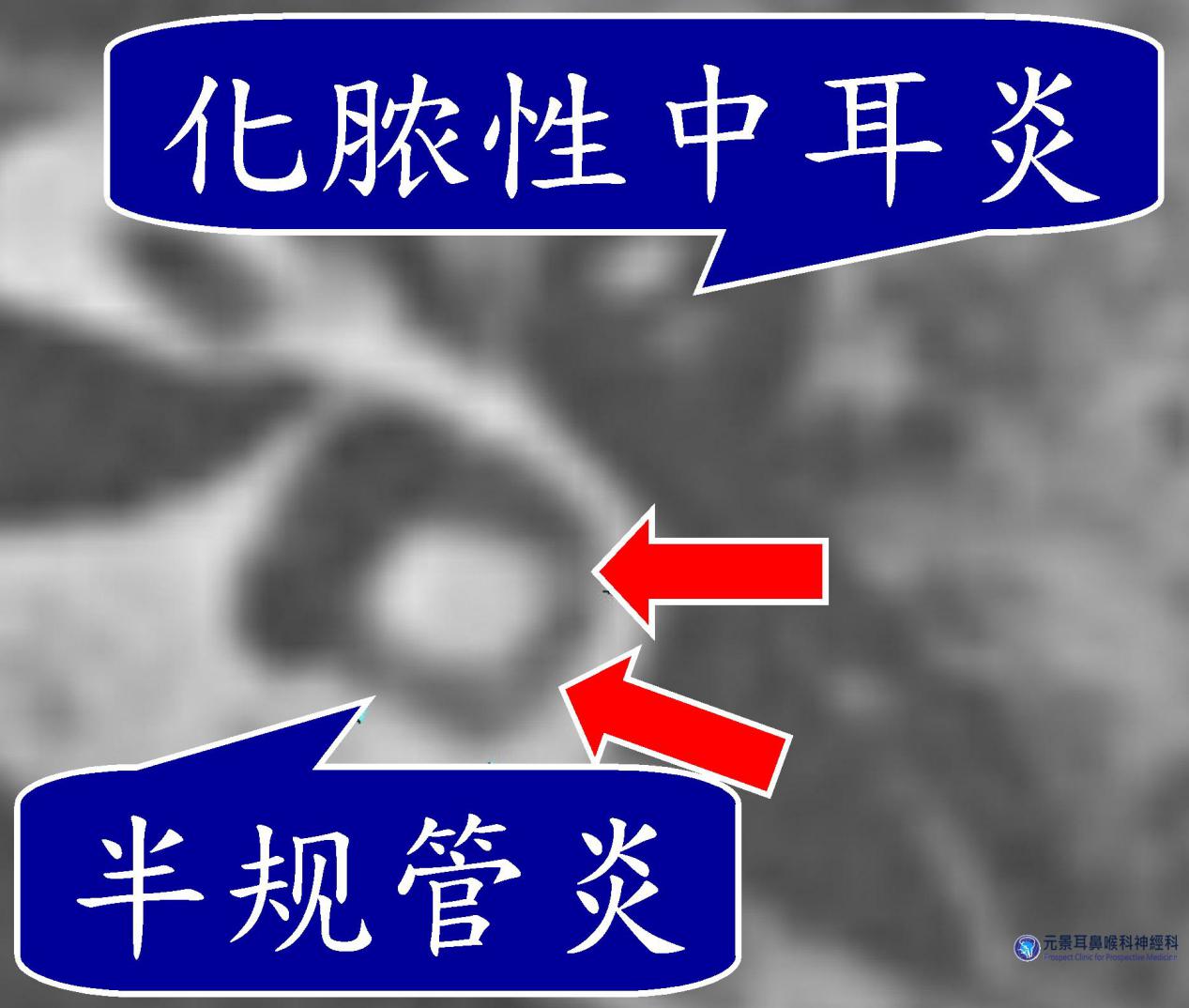 图说一:电脑断层显示左侧化脓性中耳炎,并发感染性半规管炎,半规管内有白白的物质 (箭头所指)。