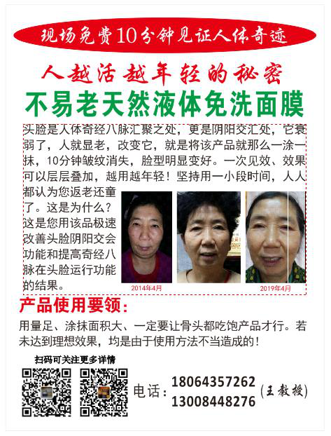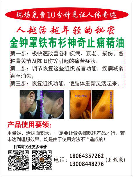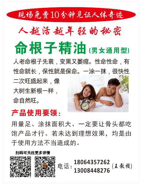 三大部分,这里将一一简介:第一:疏通头部阴阳、使面部能直观返老还童法。采用我多年研发制造的产品“不易老液体面膜”来完成人类梦想的永葆青春颜面永不衰老,或者讲能将衰老的面容在一定程度上逆转,成为又比较年轻了的容颜的产品。第二:人体下部疏通任督二脉法。采用我的“命根子精油”来完成。解决性命攸关的大问题:性命性命,有性才有命;保性就是保命。当生命由盛到衰出现时,人体与性命有关的性生殖器首先慢慢地变黑,一点点开始萎缩。这就是生命的阴阳在会阴穴这个部位(区域)交汇减弱了。不论男女,生命力不足了的表现基本一样:慢慢感第二:人体下部疏通任督二脉法。采用我的“命根子精油”来完成。解决性命攸关的大问题:性命性命,有性才有命;保性就是保命。当生命由盛到衰出现时,人体与性命有关的性生殖器首先慢慢地变黑,一点点开始萎缩。这就是生命的阴阳在会阴穴这个部位(区域)交汇减弱了。不论男女,生命力不足了的表现基本一样:慢慢感到性功能不如从前了;做爱也不那么舒服了等。身体衰老的表现越来越明显,可是自己就是没有低头看看自己的生殖器,它已经开始慢慢地变黑了,开始萎缩了,不再粉嫩了。可是知道了又能怎样?眼看自己变老却无能为力也。