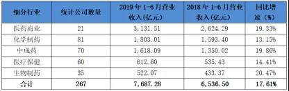 从上市公司半年报情况来看,中成药行业营收2019年1-6月同比增长明显。从统计的267家医药公司的营业收入对比来看,中成药行业市场规模居第三位(在制药工业居细分行业第二位),达到1,618.09亿元,同比增长19.86%,仅次于生物制药行业,要高出化学制药行业近7个百分点。