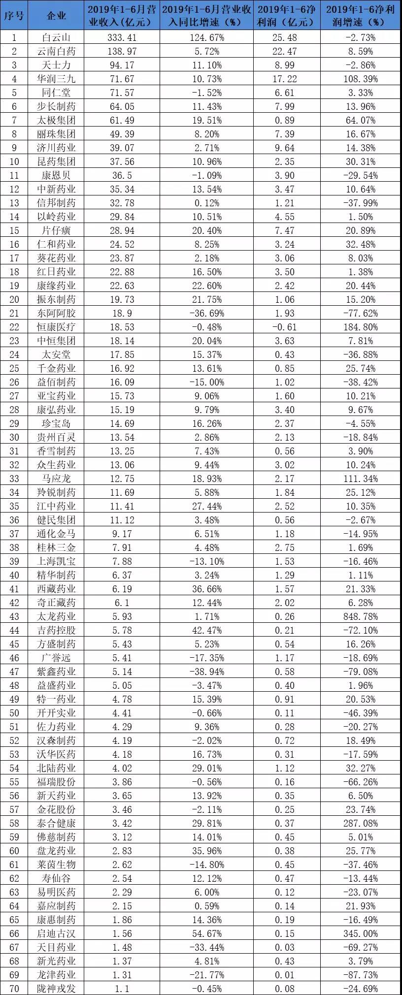 附:70家中成药企业营收、净利情况(以净利润额大小排序)