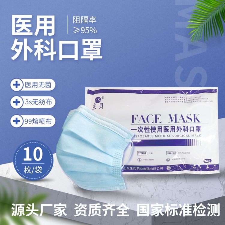 东贝一次性医用外科口罩由表层,中间层,底层,口罩带,鼻夹组成表层材料为卫生级聚丙烯仿粘布中间层材料为聚丙烯喷丝法制成的高效过滤熔喷布,底层材料为卫生级聚聚丙烯仿粘布,口罩带为涤纶线和少量氨纶线针织而成,鼻夹为可折弯可定型的聚丙烯制成。可供临床医务人员在有操作中佩戴覆盖住使用者的口,鼻。下颚,为防止病原体微生物,体液,颗粒物等直接透过提供物理屏障。