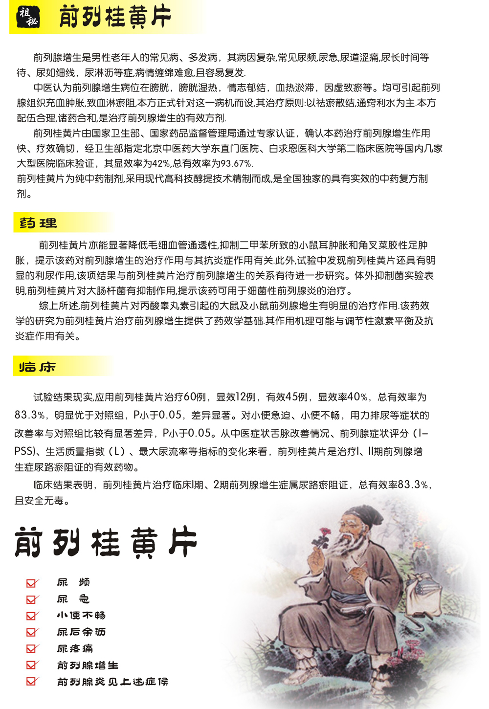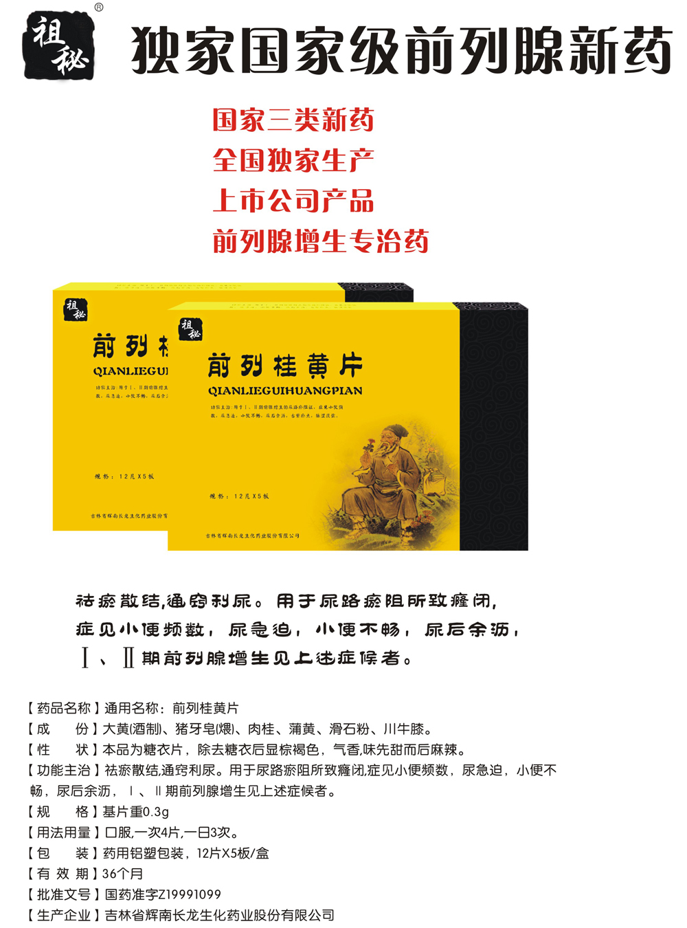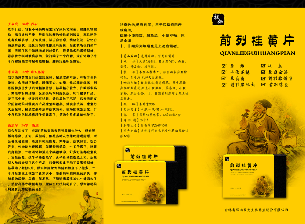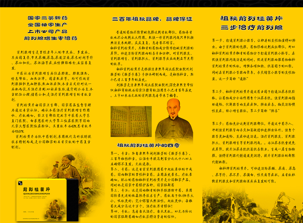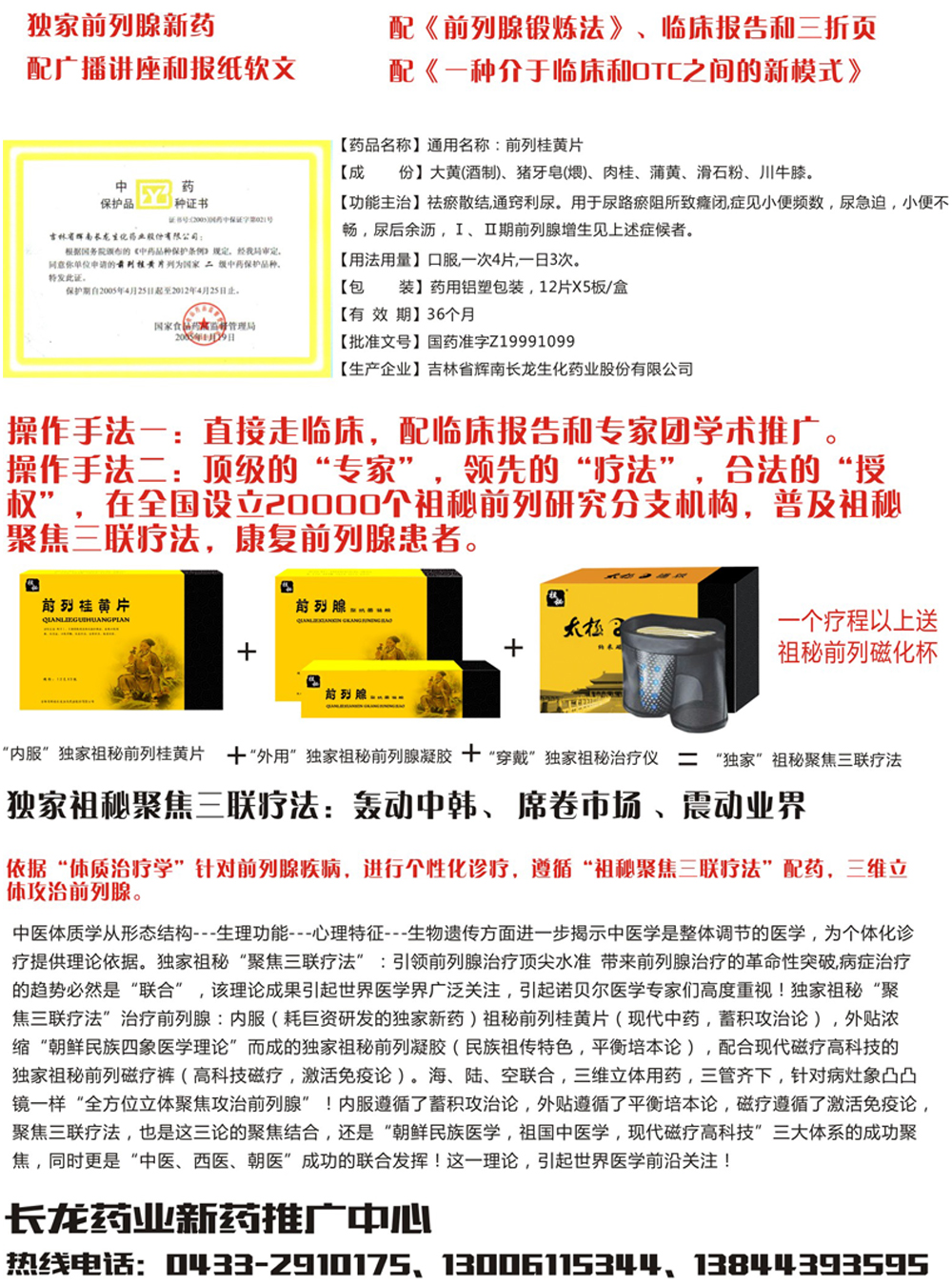 独家祖秘前列桂黄片,配临床报告可招投标。也可炒作,配全套“祖秘三联聚焦疗法”(内服独家国药祖秘前列桂黄片+外用前列消炎凝胶+穿治疗仪内裤,“海、陆、空”三维立体联合攻治前列腺),开社区前列养护中心,有明星代言,韩国前列腺专家全锡汉与央视网陈宏先生授权推广。有三折页,钥匙扣,手提袋,文化衫,路牌巨大广告牌,POP系列等全套资料提供您,欢迎来厂里考察签约。