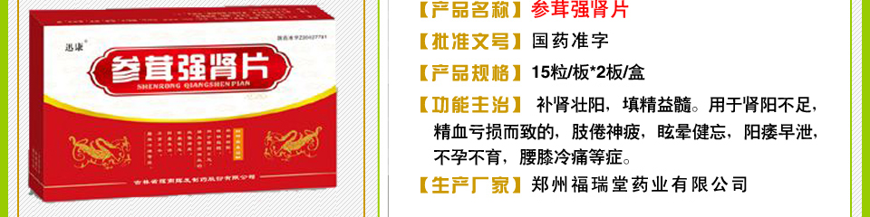 | 【功能主治】 | 补肾壮阳,填精益髓。用于肾阳不足,精血亏损而致的,肢倦神疲,眩晕健忘,阳痿早泄,不孕不育,腰膝冷痛等症。 |